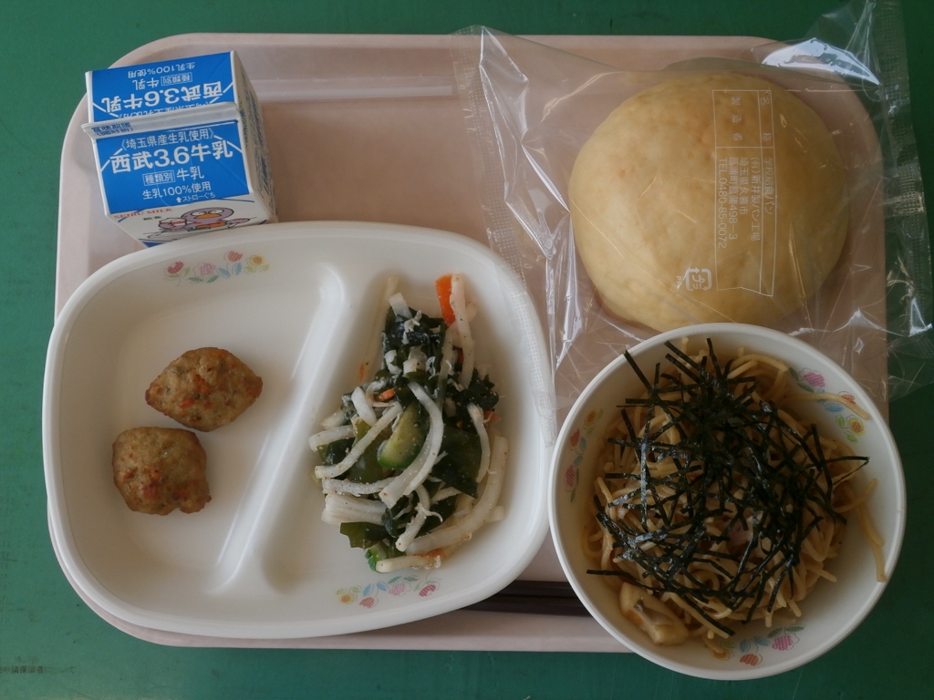 ☆今日の献立☆ 牛乳、メロンパン、和風スパゲティ 大根とじゃこのサラダ、チキンちぎり揚げ