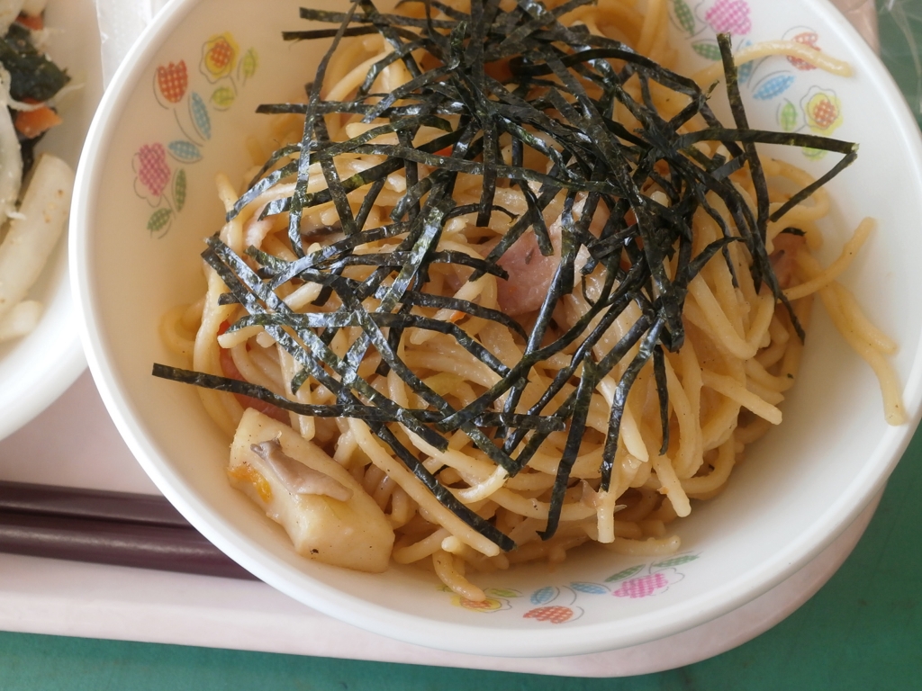 今日は和風スパゲティがおいしかったと好評でした。 しょうゆベースの味付けで、最後にクラスで 刻みのりをトッピングしました。 のりの香りも良くおいしかったです。
