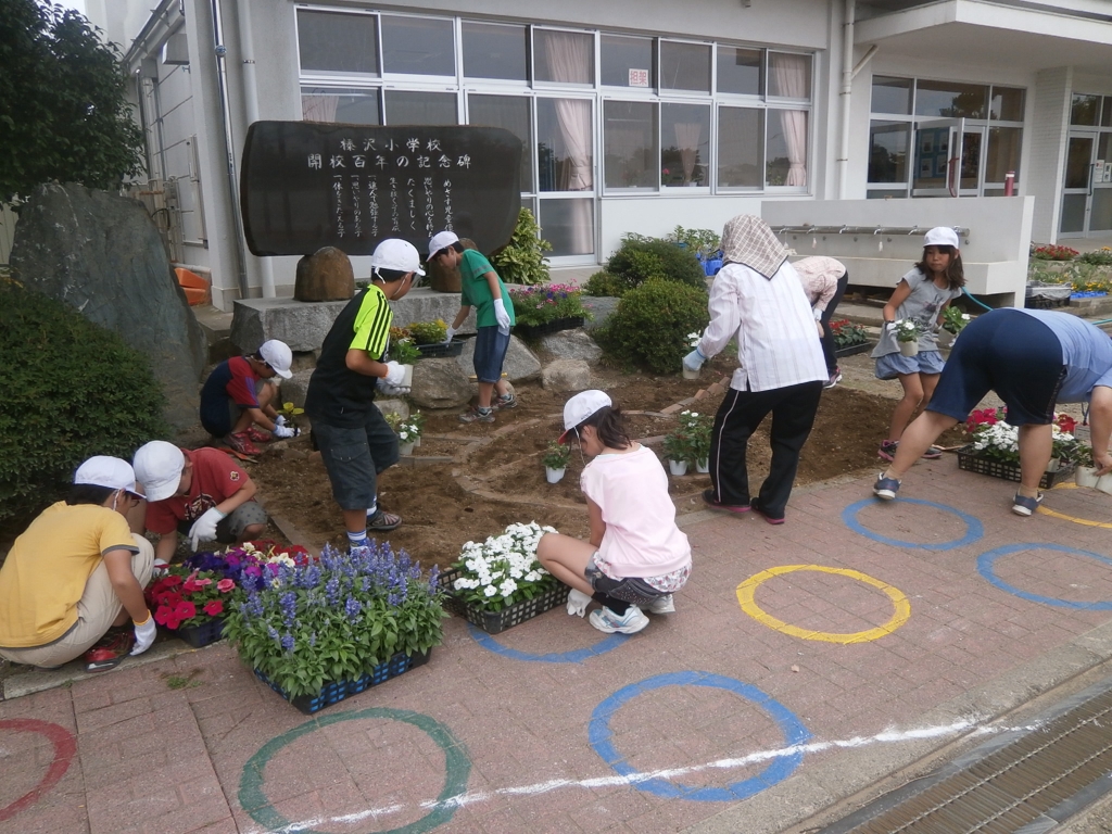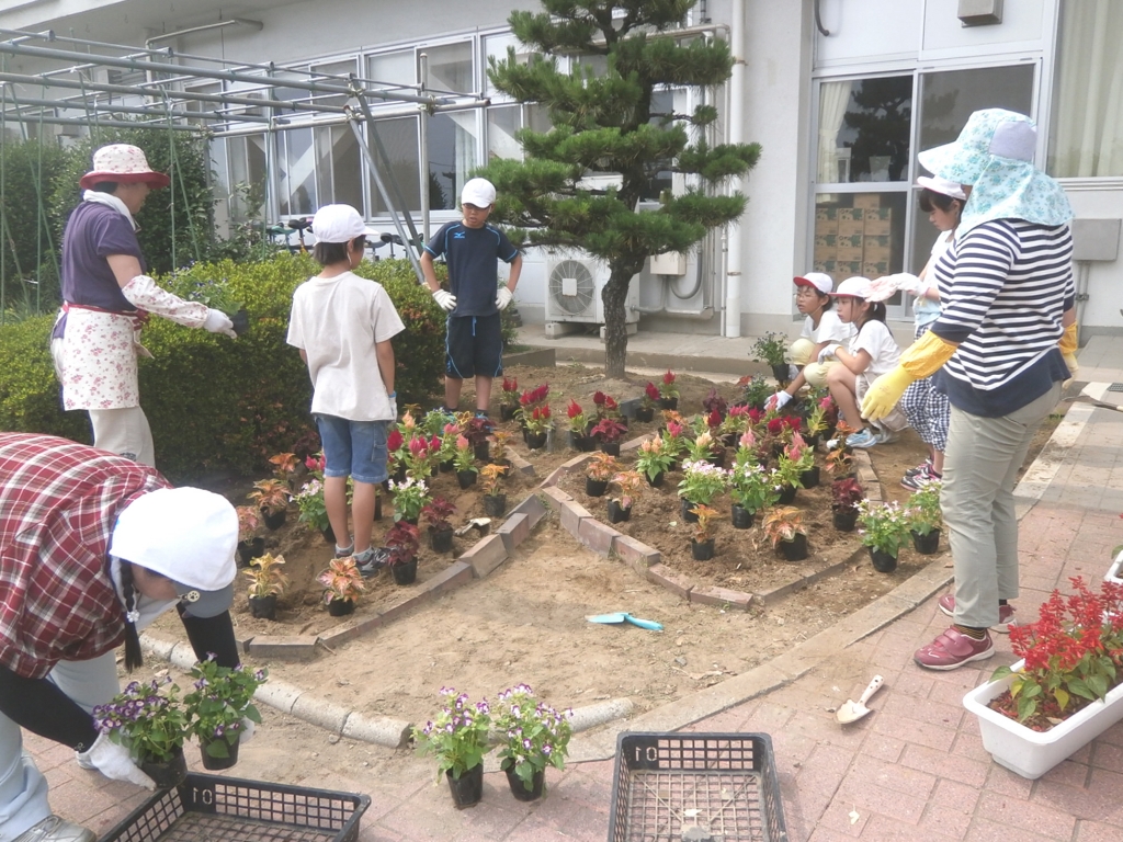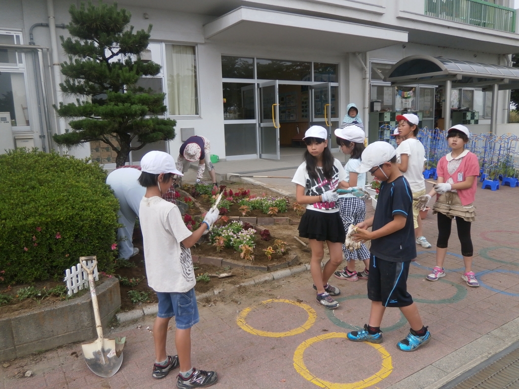 今日の5校時、5年生が民生委員の方と一緒に花壇に花を植えました。どう植えればきれいになるか、一緒に考えながら一生懸命取り組んでいました。