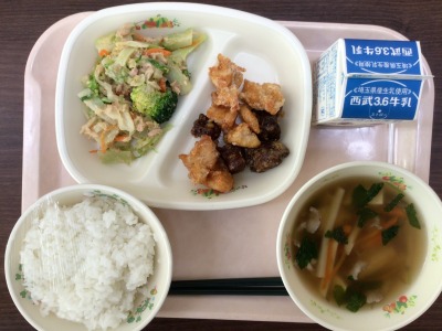 本日の給食に使用しているレバーには鉄分が豊富に含まれています。野菜などからとれる鉄分より体に吸収されやすいヘム鉄が入っています。鉄分は血を作る手助けをしてくれ、フラフラするなどの鉄欠乏性貧血予防に役立ちます。