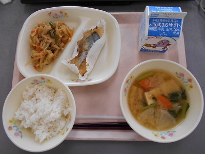 10月4日(木)の給食☆本日の献立☆ ご飯、サワラのめんたいマヨ焼、切り干し大根の炒り煮、野菜椀 今日の献立は、一昨日と変わって、純和風でした。和食の大切さが見直されてきています。これからも、和食を大切にしていきたいですね。 |