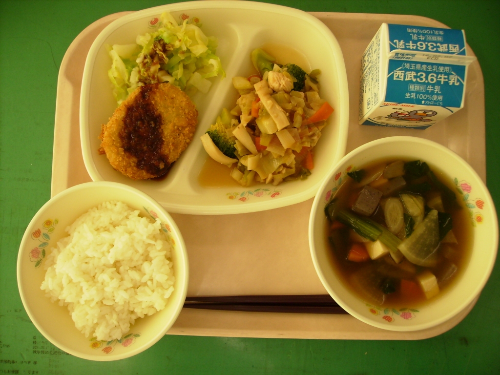 ☆今日の献立☆  牛乳、ごはん、コロッケ、ゆでキャベツ 鶏肉とねぎの味噌バター、けんちん汁 今日のメニューは、ボリュームたっぷりでした。 どのクラスも、ご飯が残ってしました。(残念。。) 鶏肉とねぎの味噌バターは、新メニューでした。