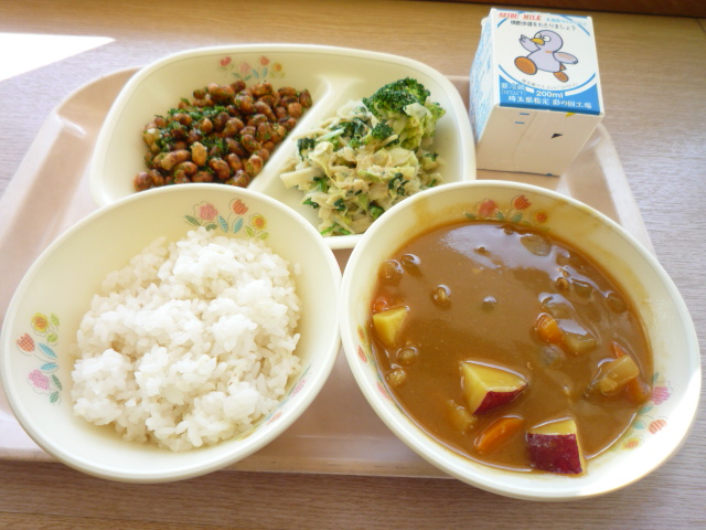 (献立)小江戸カレー 野菜のごマネーズあえ 大豆のカリカリあげ 牛乳 ( コメント)修学旅行や出張等のため久々のレポートです。 小江戸カレーには、川越関係の深いサツマイモが入っています。 サツマイモは恥ずかしがり屋さんで下に沈みがちです。スプーン で上に引きあげて撮影しました。 カレーの辛さの中に、サツマイモの甘さを程よく感じることが できました。 |