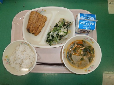 10月17日(月)の給食☆本日の献立☆ ご飯、サンマの蒲焼き、青菜とキノコのソテー、豚キムチスープ 急に冷え込んできました。こんな日は、温かい鍋でも食べたいですね。給食も、ピリ辛の豚キムチスープで温まりました。 |