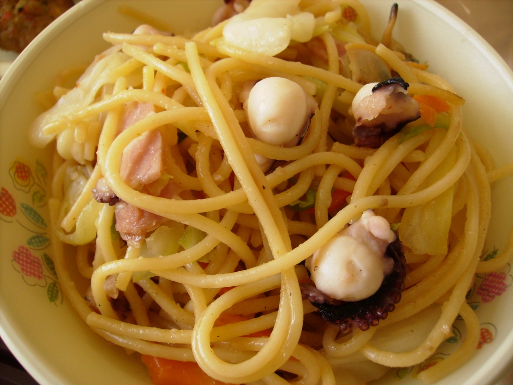 ☆今日の献立☆  牛乳、バターロール、チキンちぎり揚げ 彩りサラダ、たこのぺぺロンチーノ 今日はちょっぴりピリ辛の、ペペロンチーノを出しました。 ベーコン、たこ、あさり、にんじん、キャベツ、玉ねぎが入りました。