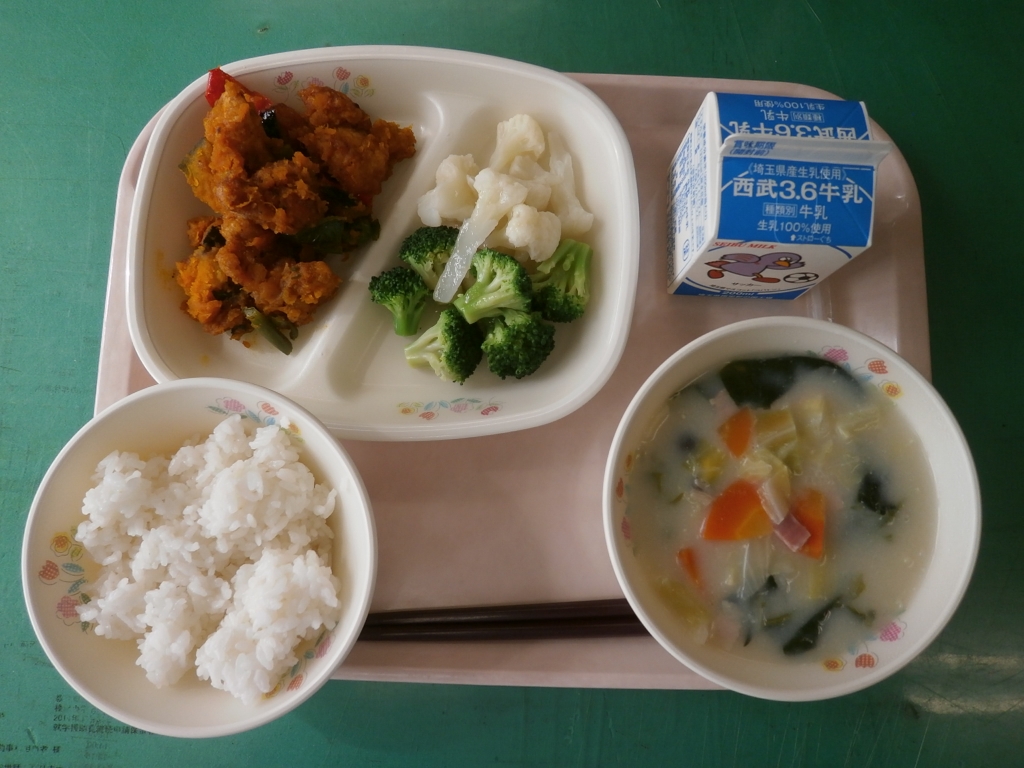 カボチャが甘くておいしかったです。 今日は、豆乳を使った野菜たっぷりのスープにしました。 牛乳を豆乳に変えることで、さっぱりとした仕上がりになります。 来週からは11月。11月は彩の国ふるさと給食月間で 深谷市の郷土料理や、地場産物を使ったメニューなど 登場する予定になっています。お楽しみに♪ |