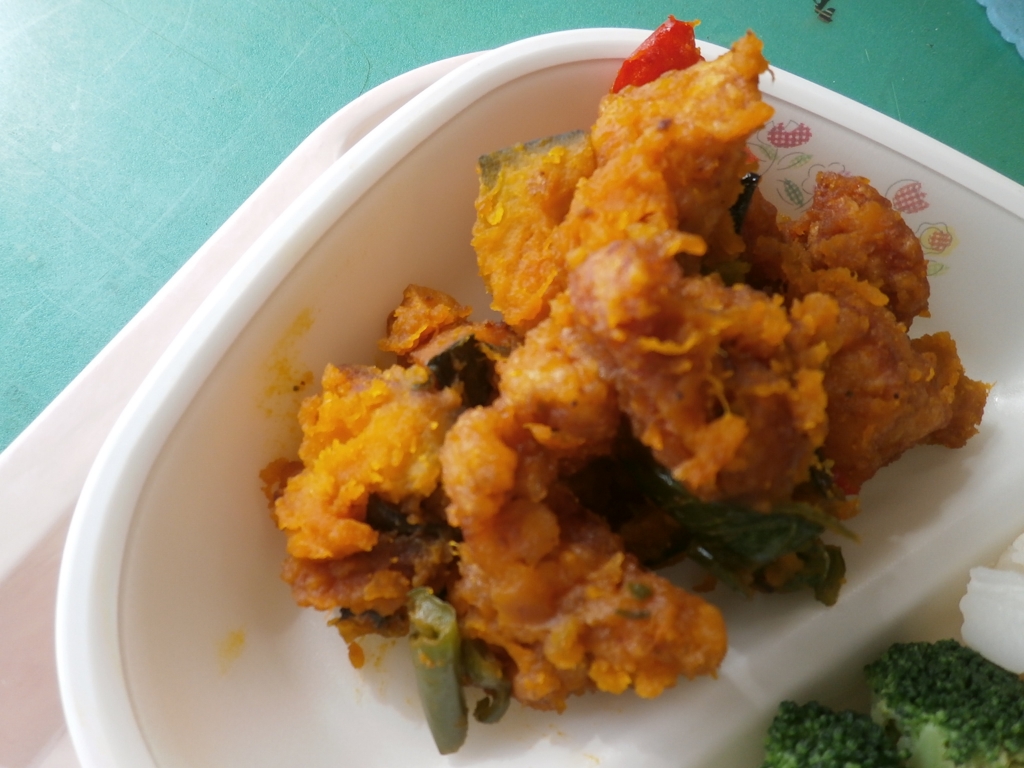 今日はハロウィンにちなんで、カボチャを使ったメニューにしました。 素揚げしたかぼちゃ、ピーマンとからっと揚げた鶏肉を、 オレンジジュースを使ったタレで和えました。