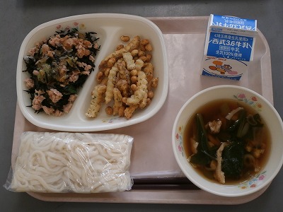 5月30日(水)の給食☆本日の献立☆ 地粉うどん、肉うどんの汁、大豆とポテト揚げ、ツナとひじきのサラダ |