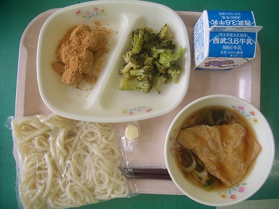 6月27日(水)の給食☆本日の献立☆ 地粉うどん、きつねうどんの汁、白玉団子のきなこ和え、ブロッコリーのピリッと漬け、チーズ 今日のうどんは、コシもあり、おいしい汁がよく絡み、余計おいしく感じました。白玉団子も、もちもちしていて、きな粉とよく合っていました。残ったきな粉は、牛乳に入れて飲みました。 |