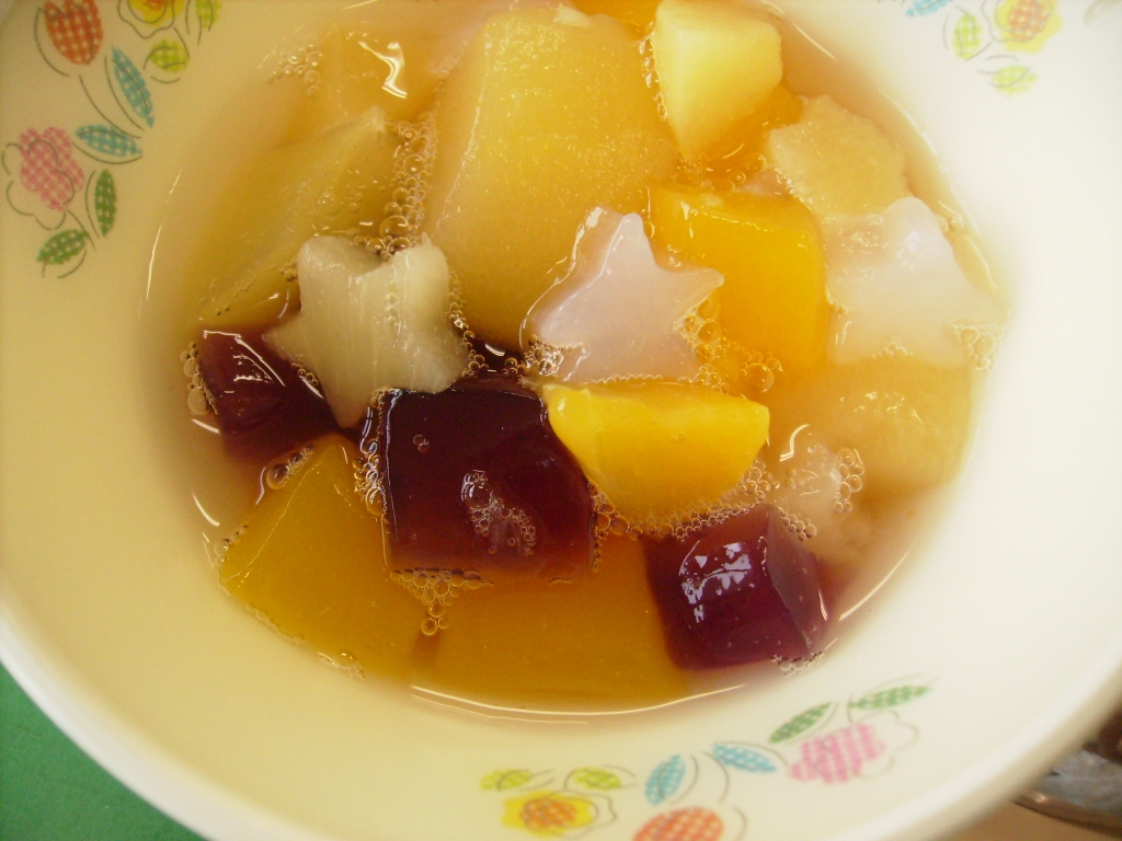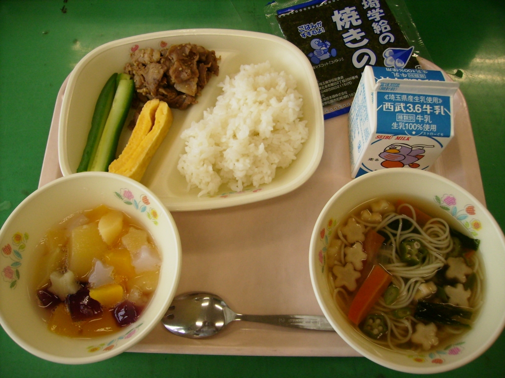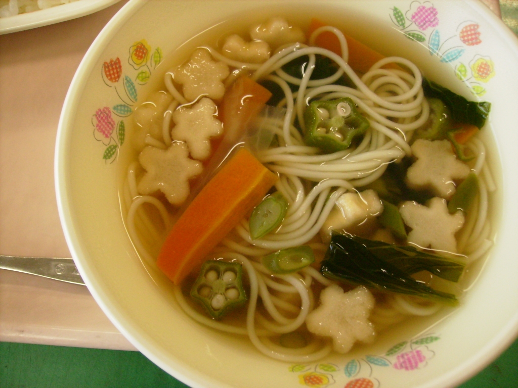 今日の献立  牛乳、酢飯、焼きのり、 手巻き寿司の具 七夕スープ、星のフルーツポンチ 今日は、一足先に七夕メニューを提供しました。 1年生は、初めての手巻き寿司給食。楽しそうに食べていました。 七夕スープに、フルーツポンチ。 星形の食材をたくさん使いました。 七夕スープには、にんじんと大根が短冊。 星の形の麩、オクラ。笹の葉に見立てたさやいんげん。 そうめんは、天の川をイメージしています。 ポンチには、星形のナタデココとパインが入りました。 |