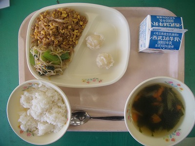 4月13日(金)の給食☆本日の献立☆ ご飯、ビビンバの具、蒸しシュウマイ、わかめスープ 胡麻の香りは食欲をそそりますね。ビビンバの具も、胡麻の香りも味も、とてもよかったです。野菜と肉と卵のバランスもよかったです。 |
