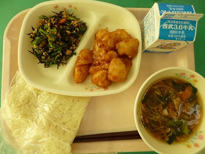 11月21日(水)の給食☆本日の献立☆ ラーメン、もやしラーメンの汁、みそポテト、ほうれん草とひじきのサラダ 秩父名物のみそポテトが出ました。この日の献立を待ち望んでいた子がいるそうです。みそポテトが食べたくて…おいしかったかな? |