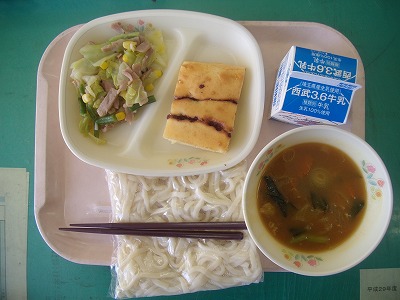 3月14日(水)の給食☆本日の献立☆ 地粉うどん、カレーうどんの汁、ヨーグルトベリーパンケーキ、春野菜のソテー 最近天候がよくなったので、野菜が値下がりしているそうです。ますます、野菜が給食に出そうですね。パンケーキは、見た目も、味も、どちらもよかったです。 |
