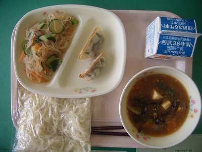 4月11日(水)の給食☆本日の献立☆ 中華麺、マーボラーメンスープ、焼き餃子、中華サラダ 待ちに待った給食が始まりました。平成30年度も、安全・安心で、おいしい給食が提供できるよう、努力してまいります。保護者の皆様の、ご理解、ご協力をお願いいたします。 |