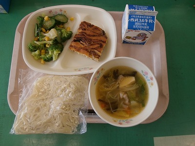 6月6日(水)の給食☆本日の献立☆ ラーメン、タンメンの汁、チョコバナナパンケーキ、温野菜 |