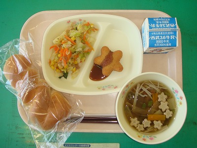7月7日(木)の給食☆本日の献立☆ ツイストパン、星のコロッケ、七夕スープ、キャベツのペペロンチーノ 今日は、七夕献立です。何を願いながら、食べたでしょうか?*「給食予定献立表」には、本日チーズが出るとありますが、12日の間違いです。 |