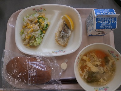 7月3日(火)の給食☆本日の献立☆ 黒パン、タラのムニエル、三色サラダ、夏風スープ、チーズ |