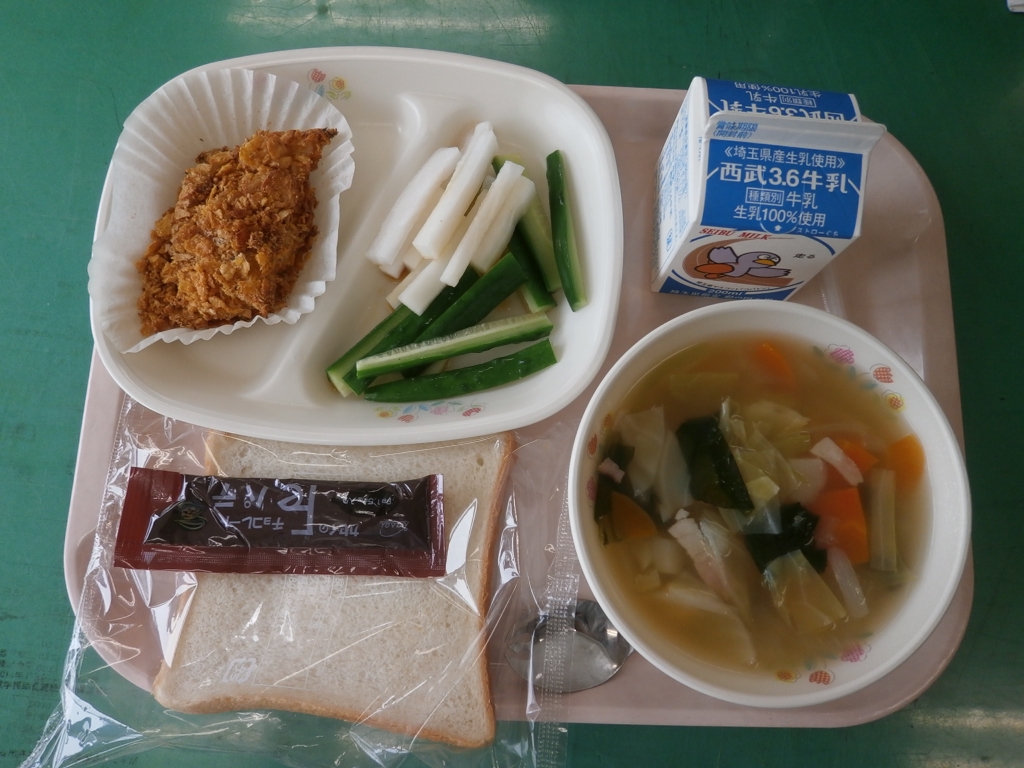 牛乳、食パン、Feパテチョコ、コンソメスープ チキンのフレーク焼き、スティック野菜
