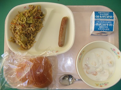 2月6日(火)の給食☆本日の献立☆ バターロール、ソース焼きそば、焼ウインナー、ヨーグルト和え ソース焼きそばに、桜エビが入っていました。心地よい食感と共に、春の香りも感じました。ヨーグルト和えにも、フルーツがたっぷり入ってちょうどよい味になっていました。 |