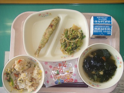 3月1日(金)の給食☆本日の献立☆ ちらし寿司、いそべししゃもフリッター、胡麻和え、すまし汁、ひなあられ 今日は、ひな祭り献立でした。ちらし寿司が具もたくさん入っていてとてもおいしかったです。ひなあられもおいしく食べたでしょうか? |