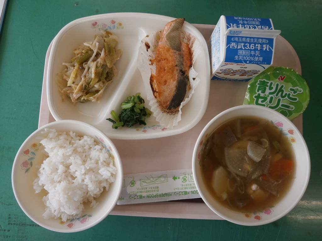 牛乳、ごはん、鮭のめんたいマヨネーズ焼き ねぎぬた、けんちん汁、青リンゴゼリー おまけの、大根の葉のあさづけ