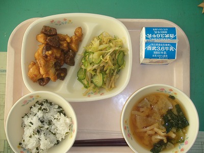 12月18日(月)の給食☆本日の献立☆ わかめご飯、鶏肉とレバーのオレンジソース、ヘルシーサラダ、みそ汁 ヘルシーサラダ。サラダだけでもヘルシーなのに、さらにヘルシーが付いたサラダとは?食べて分かりました、ゴボウがたっぷり入っています。食物繊維たっぷりというわけですね。 |