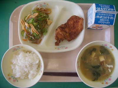 6月29日(金)の給食☆本日の献立☆ ご飯、ソースカツ、ぱりぱりサラダ、なめこ汁 パリッと揚がったソースカツ。ご飯に載せて、ソースカツ丼にして食べるようです。暑い毎日が続きますが、暑さにカツよう、パワーを付けてほしいです。ちなみに、本日関東甲信地方が梅雨明けしたとのことです。暑いわけですね。 |