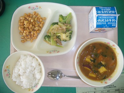 11月19日(月)の給食☆本日の献立☆ ご飯、小江戸カレー、大豆のカリカリ揚げ、ブロッコリーサラダ 小江戸カレーは、ジャガイモの代わりにさつまいもが入っています。カレールーの辛さとさつまいもの甘さが、不思議に合っています。 |