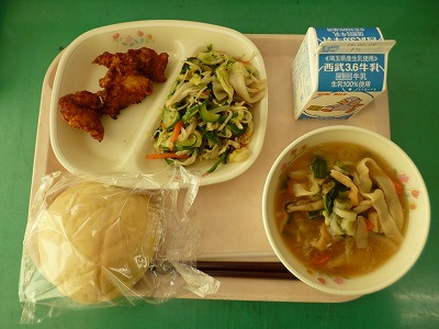 1月30日(火)の給食☆本日の献立☆ メロンパン、麹から揚げ、ほうれん草のサラダ、煮ぼうとう 子どもは大喜びのメニューだったことでしょう。6年生は残念ながら、社会科見学なので、食べられませんでした。でも、手作りのおいしいお弁当を幸せそうに食べていましたが… |
