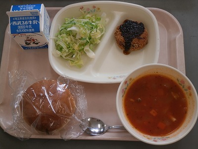 5月29日(火)の給食☆本日の献立☆ ハンバーガーパン、メンチカツ、ゆでキャベツ、ミネストローネ |