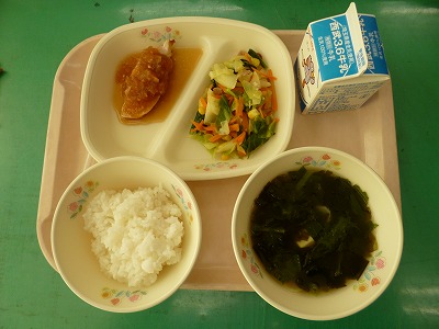 12月9日(金)の給食☆本日の献立☆ ご飯、豚肉のアップルソース、キャベツのペペロンチーノ風、わかめスープ |