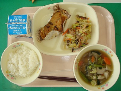 10月13日(木)の給食☆本日の献立☆ ご飯、サバのネギミソ焼き、野菜炒め、だまっこ鍋 においのちょっと強いサバも、ネギミソの味付けなら苦手な子も食べられそうです。 |