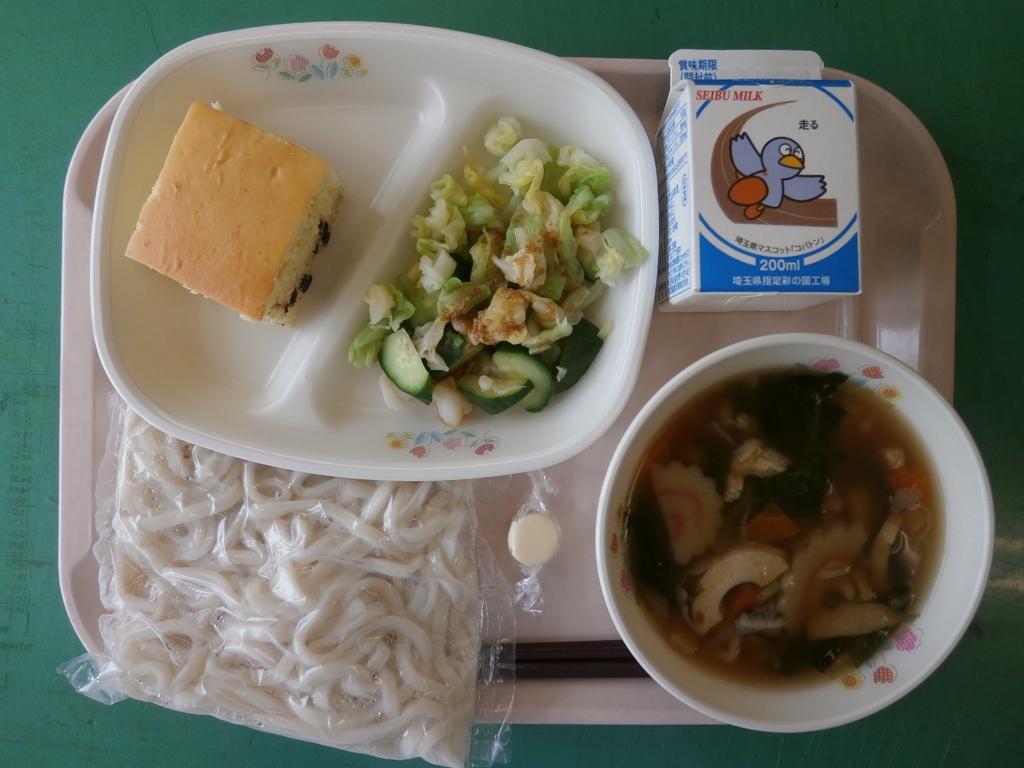 ☆今日の献立☆  牛乳、五目うどん、温野菜サラダ ブルーベリーパンケーキ 今日は、ブルーベリーが入ったパンケーキを出しました。 ふわふわにできあがり、つぶさないように丁寧にカットしました。 ブルーベリーは、これから旬を迎える果物で、目にいい栄養素 ポリフェノールがたくさん含まれているのが特徴です。 このパンケーキには、そのほか、学校の烏骨鶏の卵、 粉チーズが入り栄養満点に仕上がりました。 切れ端を6年生から順番にお裾分けにいきました。 みんな笑顔で食べていました♪ |
