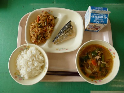 10月5日(木)の給食☆本日の献立☆ ご飯、サバの塩焼き、切り干し大根の炒り煮、豚キムチスープ 今日は、5年生の社会科見学でしたので、代わりに教頭が検食をしました。 「豚キムチスープが、ピリ辛で、食欲が増します。おいしかったです。ごちそうさま。」と感想を書いていました。 |