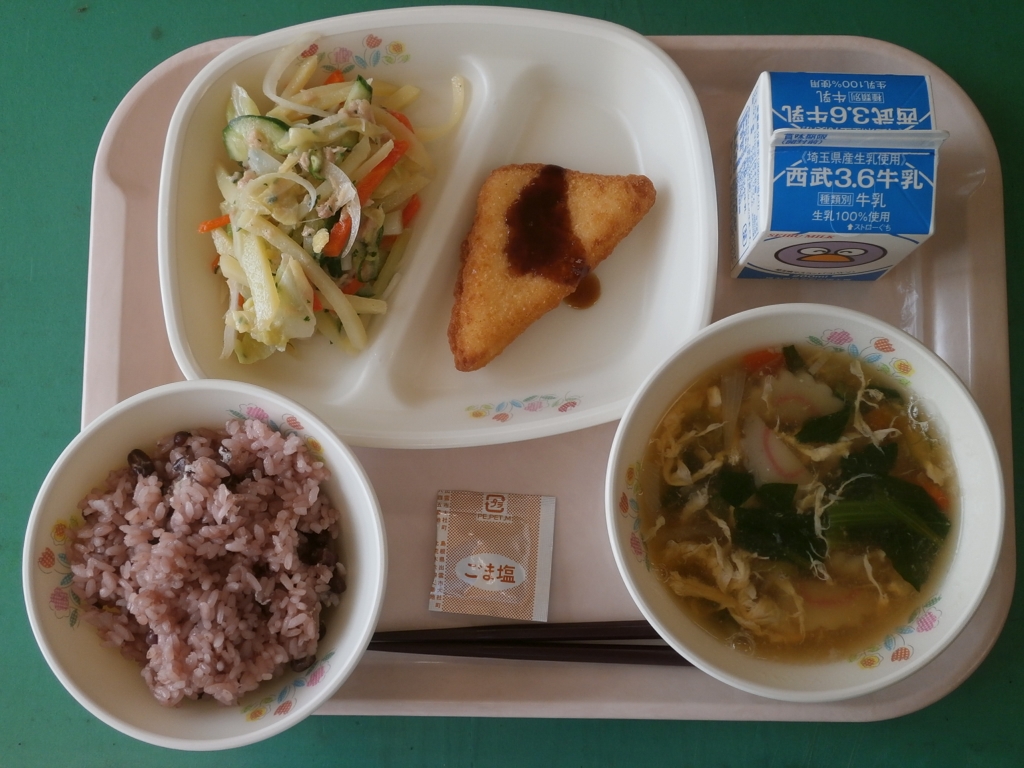 ☆今日の献立☆ 牛乳、赤飯〔ごま塩〕、チーズはんぺんフライ ツナと野菜のミックスサラダ、かき玉汁