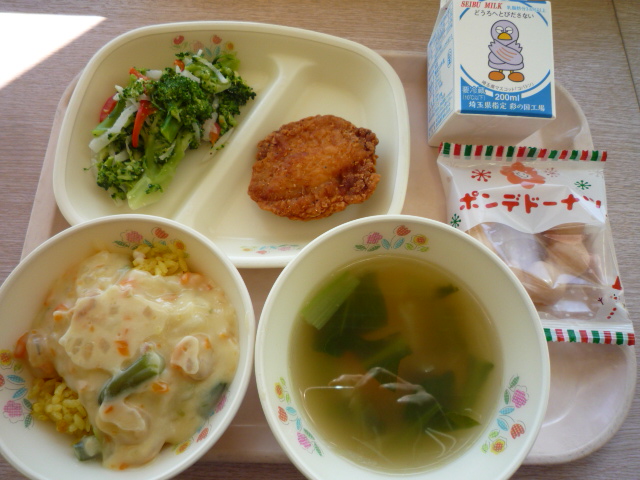 (献立) カレーピラフドリア風 フライドチキン クリスマスサラダ オニオンスープ クリスマスドーナツ 牛乳 (コメント) チキンが大きめで、ボリュームがあります。 クリスマスサラダを見て、家ではツリーを何年も出していないことを思い出しました。 今日で、今年の給食は終わりです。 給食紹介をご覧いただきありがとうございました。 皆様、よいお年をお迎えください。  |