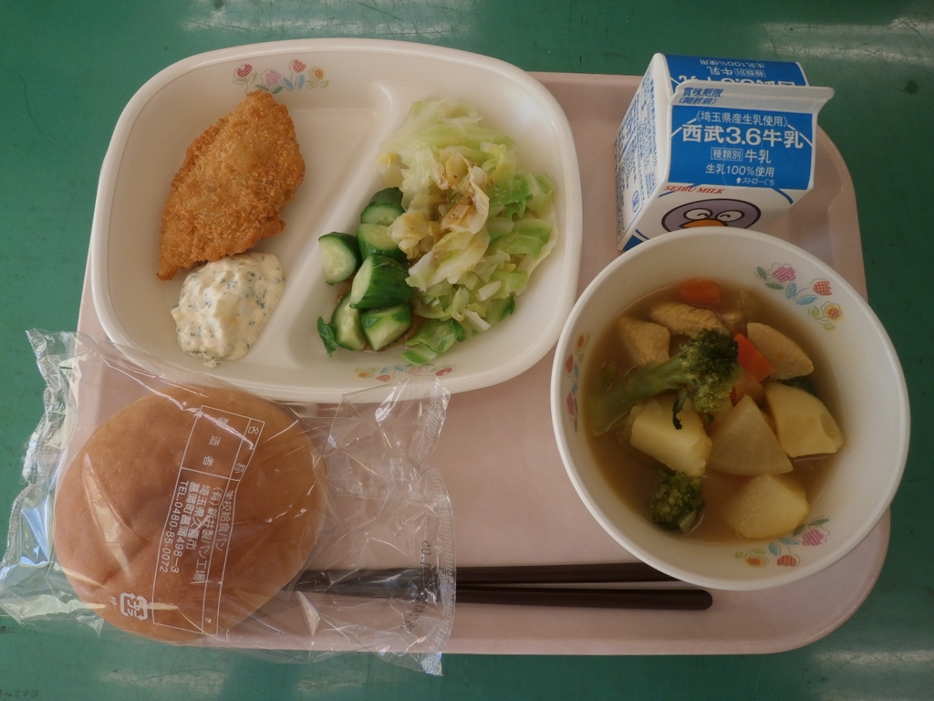 牛乳、子どもパンスライス、和風カレーポトフ アジフィーレフライ、手作りタルタルソース 温野菜サラダ