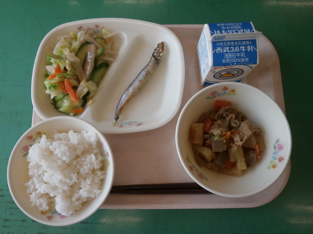 今日は寒くなっておいしくなってきた「大根」をたっぷり使って 豚肉や、さつま揚げ、こんにゃくと一緒に煮こみました。 大根に味がしみていておいしかったです。 サラダも、旬のごぼうをささがきにして茹でて、 キャベツ、きゅうり、にんじんをごまドレッシングで食べました。 ししゃももは、骨ごと食べることができて、骨を丈夫にする カルシウムがたっぷり含まれています。 子どもたちは、「頭からしっぽまで食べたよ」と言っていました。