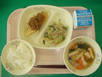 9月28日(水)の給食☆本日の献立☆ ご飯、白身魚の南蛮漬け、野菜炒め、里芋のみそ汁 南蛮漬けと言っても、胡麻ネギソースがたっぷりかかった調理法です。さっぱりしていて、胡麻とネギの風味が食欲を刺激します。 |
