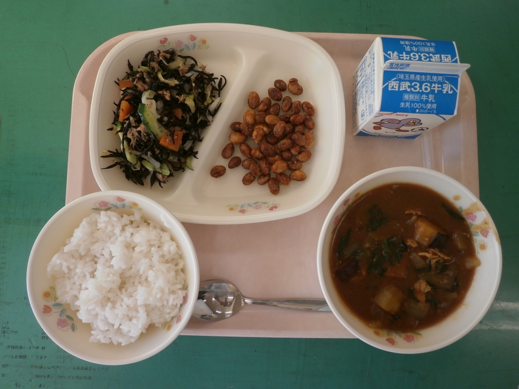 牛乳、ごはん、小江戸カレー 大豆のカリカリ揚げ、ツナとひじきのサラダ