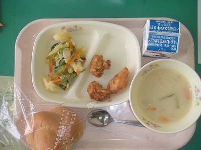 9月11日(火)の給食☆本日の献立☆ フラワーロールパン、こうじ唐揚げ、キャベツのペペロンチーノ、カブの豆乳スープ 最近の給食には、様々なパンが出ます。コッペパンなどはむしろ少ない方です。今日のパンも、フラワーロールパンで、見た感じが花のような形になっています。ふっくら柔らかで、とてもおいしかったです。 |