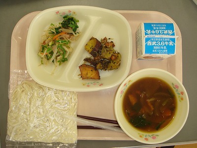 11月30日(水)の給食☆本日の献立☆ うどん、カレーうどんの汁、さつまいもと大豆の胡麻からめ、深谷ネギのナムル 11月は彩の国ふるさと学校給食月間でした。地域の特産や名物を取り上げたメニューに気づかれたでしょうか?今日は言わずと知れた深谷ネギが使われています。これからは榛沢名物ブロッコリーがたくさんでるでしょうか? |
