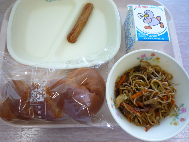 【献立】 ソース焼きそば 焼きフランク 黒パン 牛乳 ソース焼きそばには豚肉が入っています。豚肉は、体の疲れを和らげる効果のあるビタミンB1が鶏肉や牛肉より高い割合で入っているそうです。 黒パンも、味や形が毎日違いますので楽しめます。 今日は焼きそばが出ていますが、麺の日ではなく、やはりパン食というのでしょうね。 |