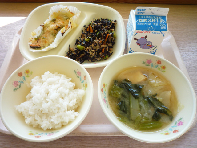 鮭のチーズ焼き・ひじきのそぼろ炒め・味噌汁