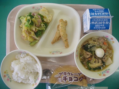 3月9日(金)の給食☆本日の献立☆ ご飯、うま煮丼の具、ワカサギのフリッター、花野菜のサラダ、チョコクレープ うま煮丼の具をご飯に載せて食べると、ご飯のおかわりがしたくなるでしょうね。花野菜のサラダのドレッシングがとてもおいしかったです。寒い日でしたが、子ども達はチョコクレープを食べて嬉しかったことでしょう。 |