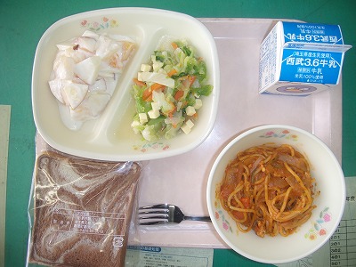 3月19日(火)の給食☆本日の献立☆ マーブル食パン、トマトクリーム・ジェノバ風パスタ、フレンチサラダ、ヨーグルト和え スパゲティは、自校給食なので柔らかくなりすぎず、食感もよく、とてもおいしかったです。ヨーグルト和えも、子どもたちには人気でしょうね。 |
