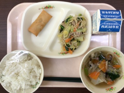 本日の給食で使用しているビーフンは中国発祥のお米から作られている白い麺です。お米から作られているため炭水化物として体を動かすエネルギーに変換されます。