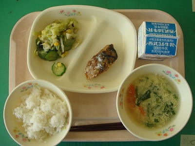 11月7日(月)の給食☆本日の献立☆ ご飯、揚げサバのチリソース、海藻サラダ、ニラとたまごのスープ 揚げサバは、外がカリッと、中はふっくらと…おかずにちょうど良い味付けもあり、とてもおいしかったです。 |