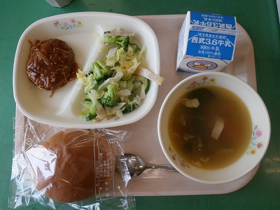 4月12日(火)の給食平成28年度最初の給食です。今年も、おいしい給食をもりもり食べて、健康な体を作りましょう。☆今日の献立☆ 子どもパン(スライス)、ハンバーグ(デミグラスソース)、ブロッコリーサラダ、野菜コンソメスープ |