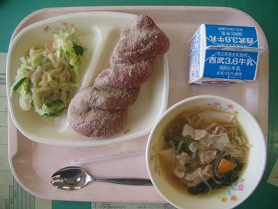 6月26日(火)の給食☆本日の献立☆ キャラメルあげパン、ドレッシング和え、ワンタンスープ 今日のあげパンは、何と、キャラメル風味のあげパンでした。食べる前は、半信半疑だったのですが、食べたら…確かにキャラメルの味がします。子どもたちは喜んだでしょうか? |